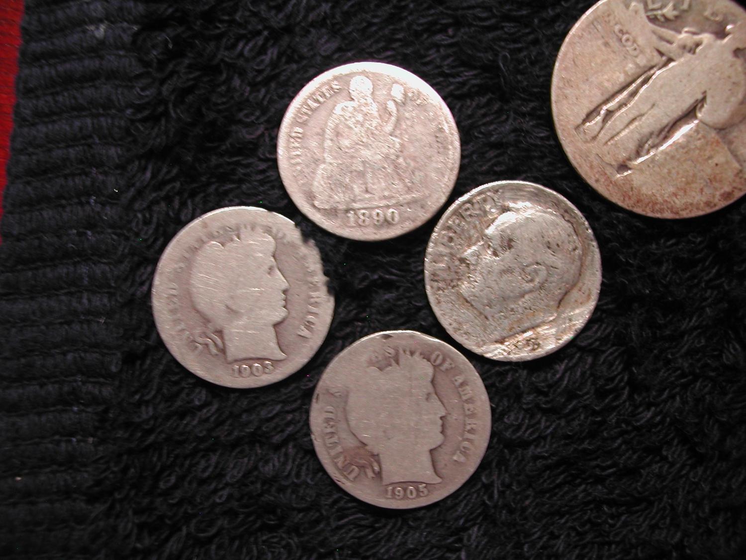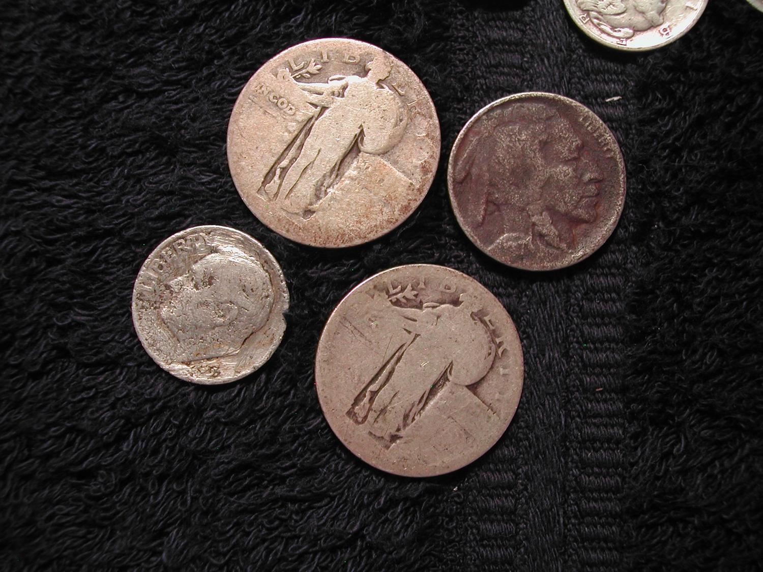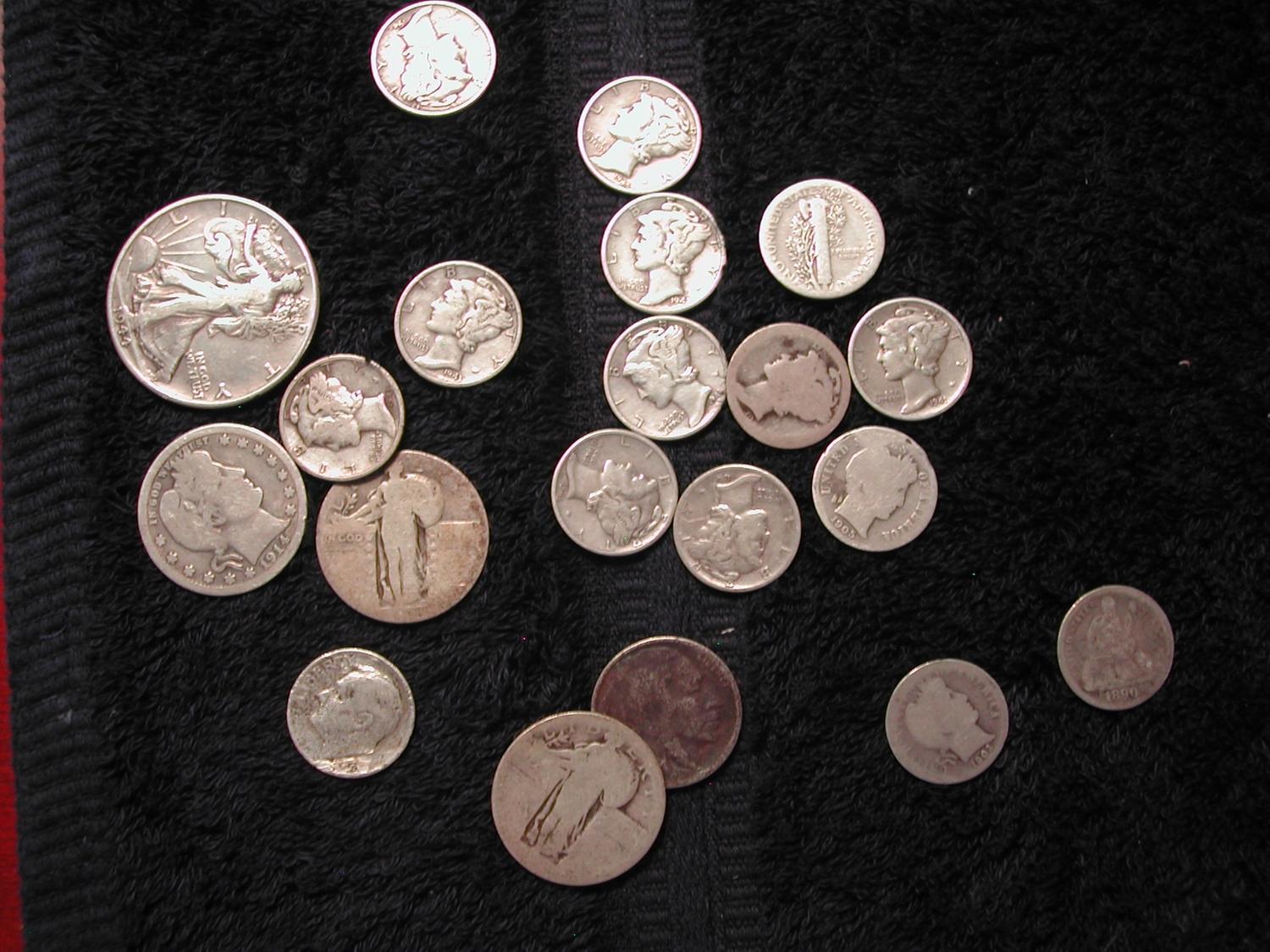 1944 WALKING LIBERTY HALF, 11 MERCURY DIMES-2-1941, 2-1942, 2-1943, 1944, 1945, 2 UNREADABLE 1914 QUARTERS, 1953 ROOSEVELT DIME, BUFFALO NICKEL, 1890 & 1903 DIME (ONE MONEY)