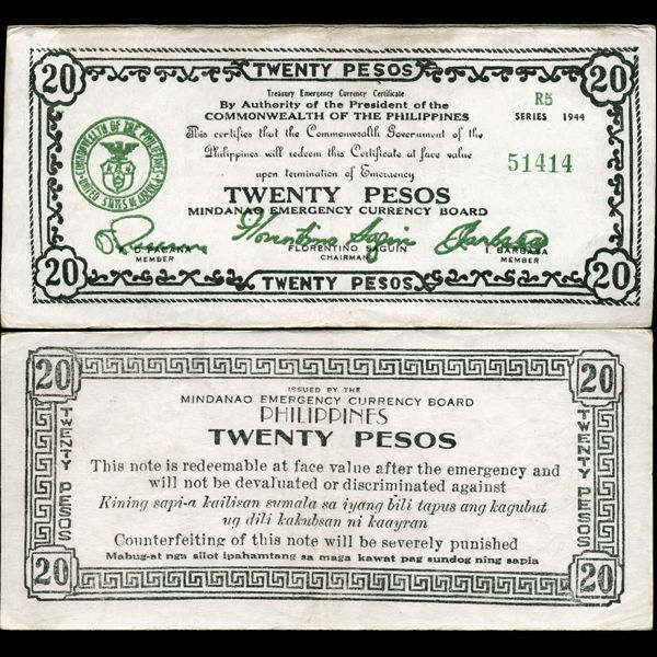 1944 WW2 Guerrilla Rebel Philippines 20P Note Mindinao (CUR-007299)