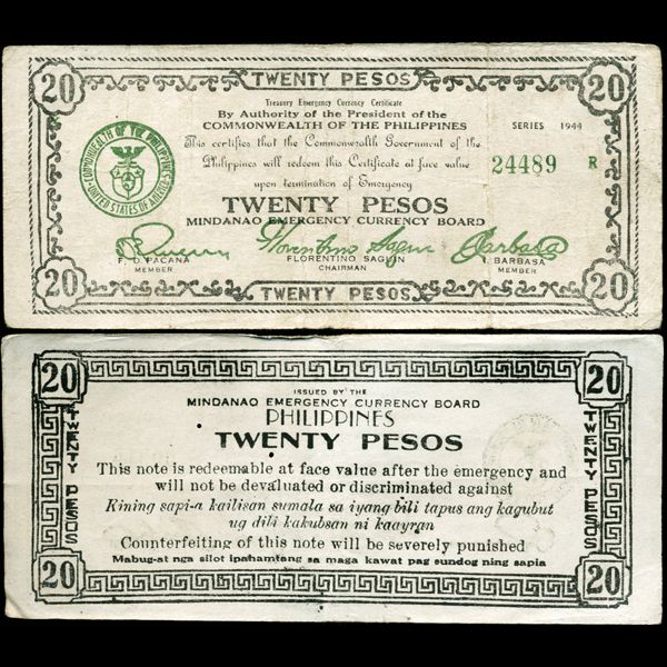1944 WW2 Guerrilla Rebel Philippines 20P Note Mindinao (CUR-07298)