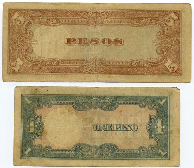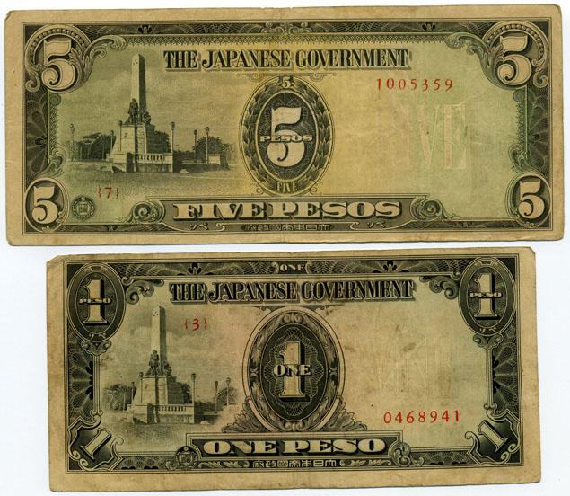 Scarce pair of Philippines Japanese invasion money 1 and 5 peso ; circulated to crisp circulated condition; WW2 antique