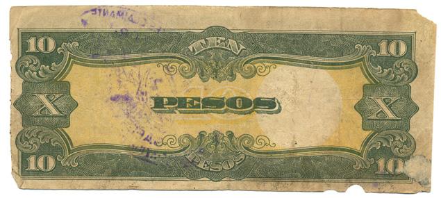 Scarce Philippines Japanese invasion money; 10 peso; circulated condition with RARE bank safekeeping stamp; WW2 antique