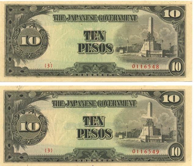 Scarce pair of Philippines Japanese invasion money 10 peso with sequential serial numbers; crisp uncirculated condition; WW2 antique