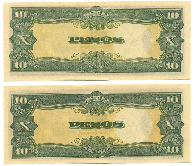 Scarce pair of Philippines Japanese invasion money 10 peso with sequential serial numbers; crisp uncirculated condition; WW2 antique