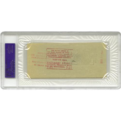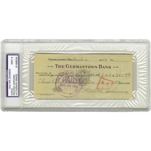 <B>1944 Walter Johnson Signed Check.</B></I> "He's got a gun concealed about his person," journalist Ring Lardner once said of the mighty Big Train, "They can't tell me he throws them balls with his arm." The greatest fireballer of his era filled out and signed this personal check from "The Germantown Bank" entirely in his own 9/10 hand. The check pays $395 to "Equitable Life Assurance Society of U.S." Official bank stamping appears on front and verso, and a hole at center results from puncture by a filing spike, but these issues are of little concern and the autograph in particular remains all but untouched. A top-shelf example. Encapsulated by PSA/DNA for protection and unquestioned authenticity.