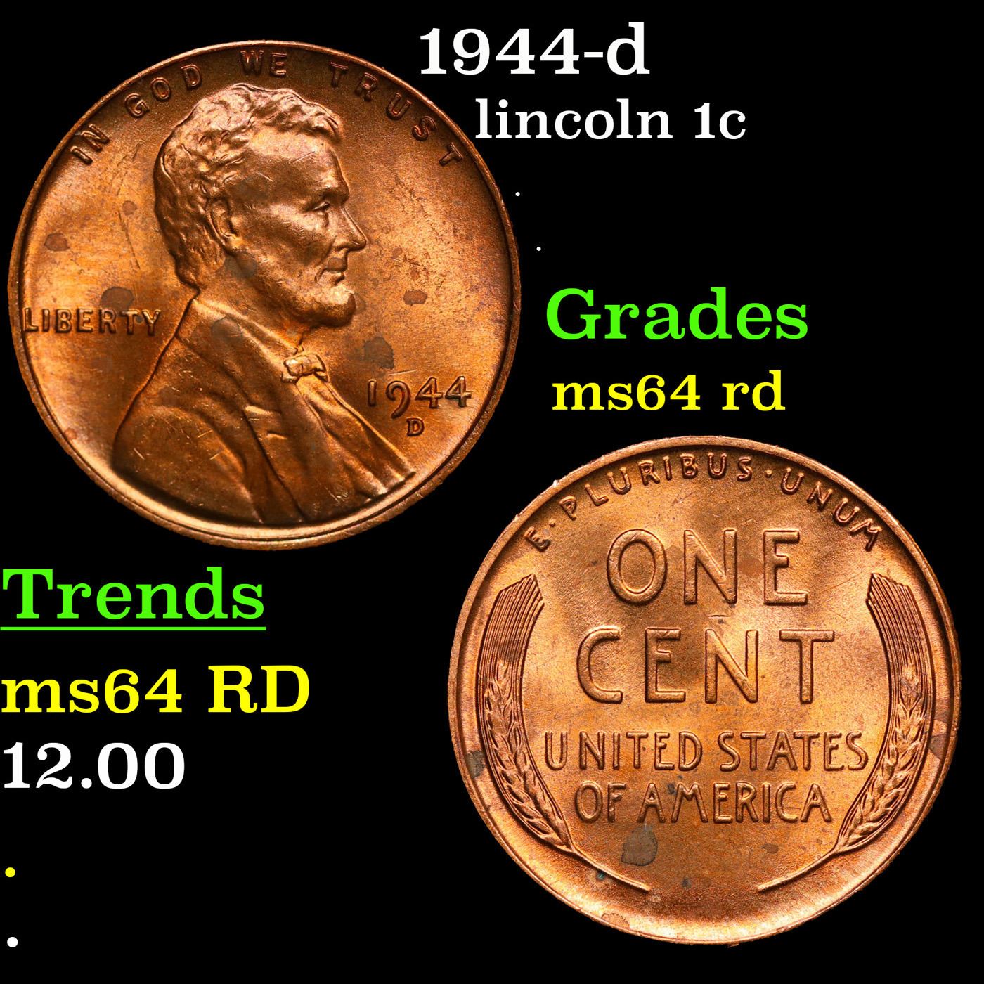 1944-d Lincoln Cent 1c Grades Choice Unc RD.