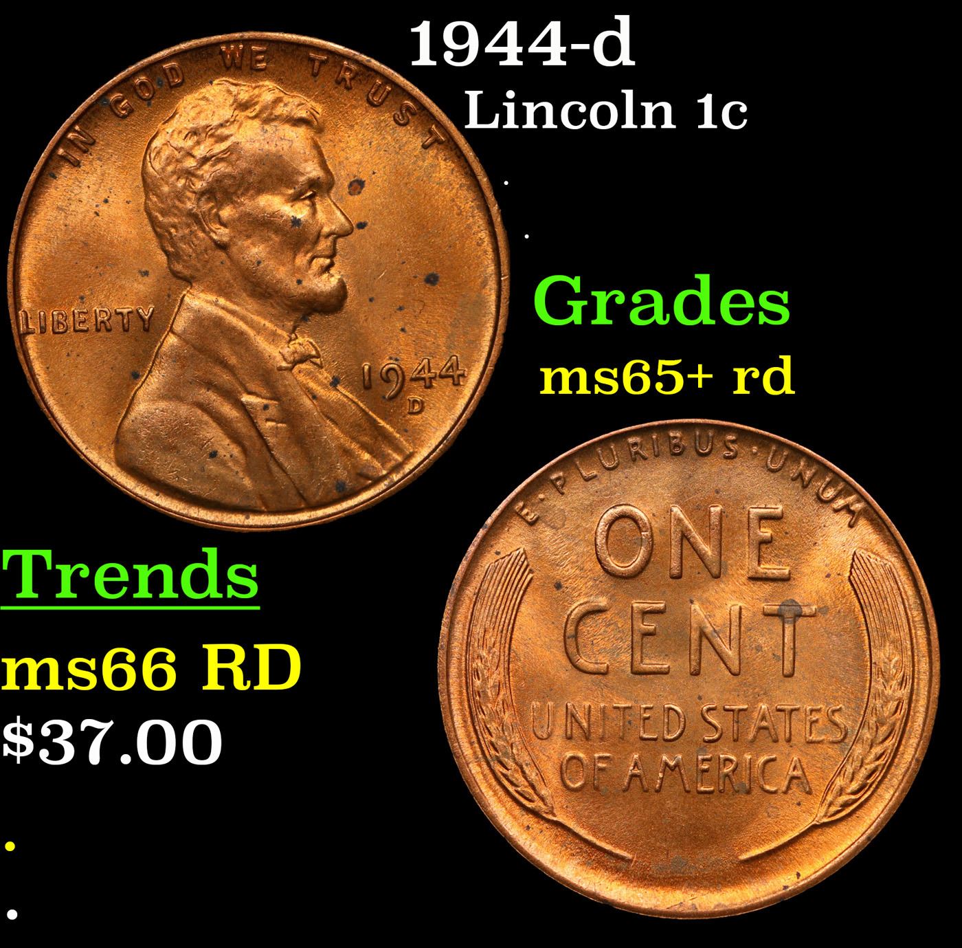 1944-d Lincoln Cent 1c Grades Gem+ Unc RD.