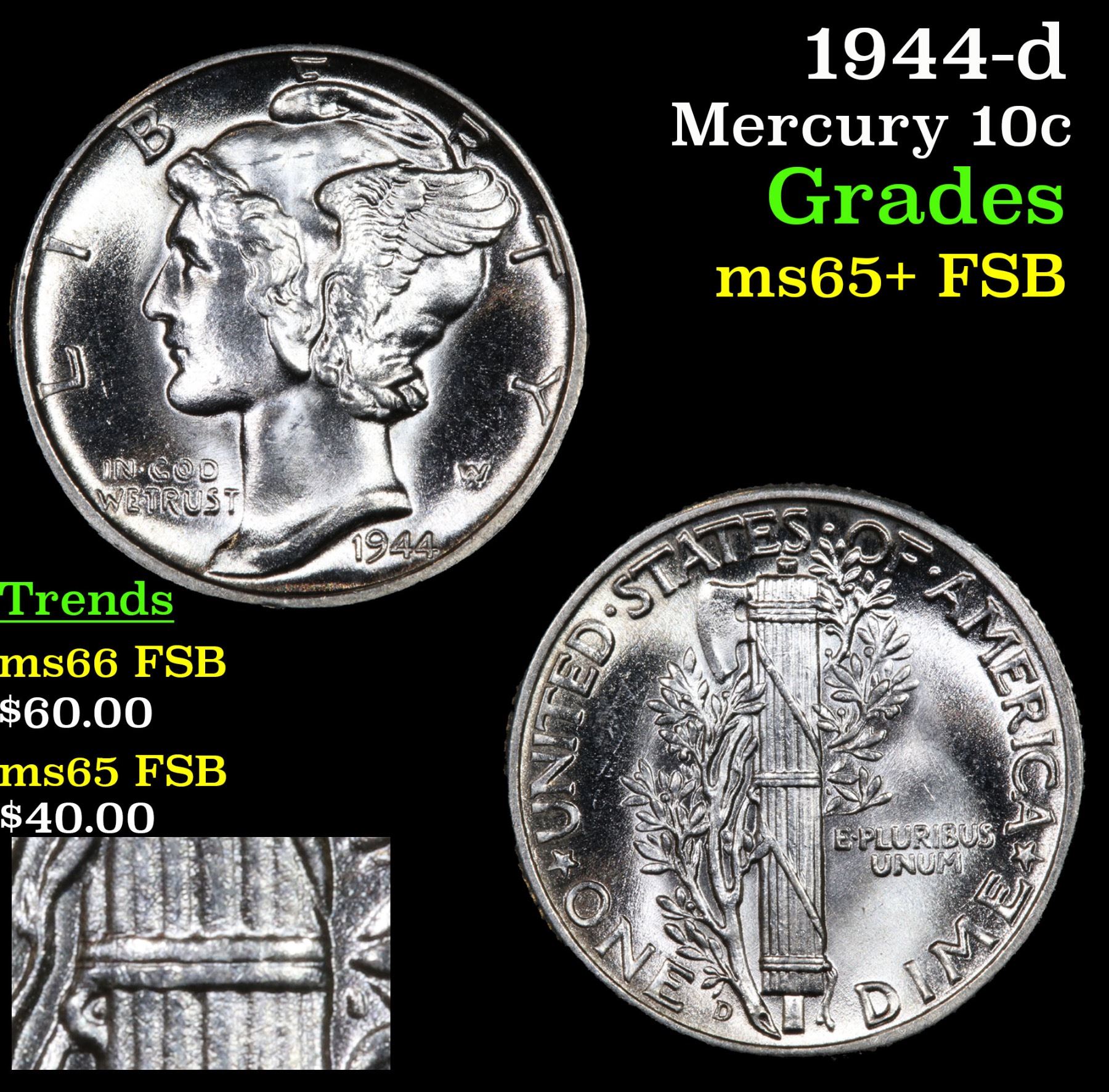 1944-d . . Mercury Dime 10c Grades GEM+ FSB.