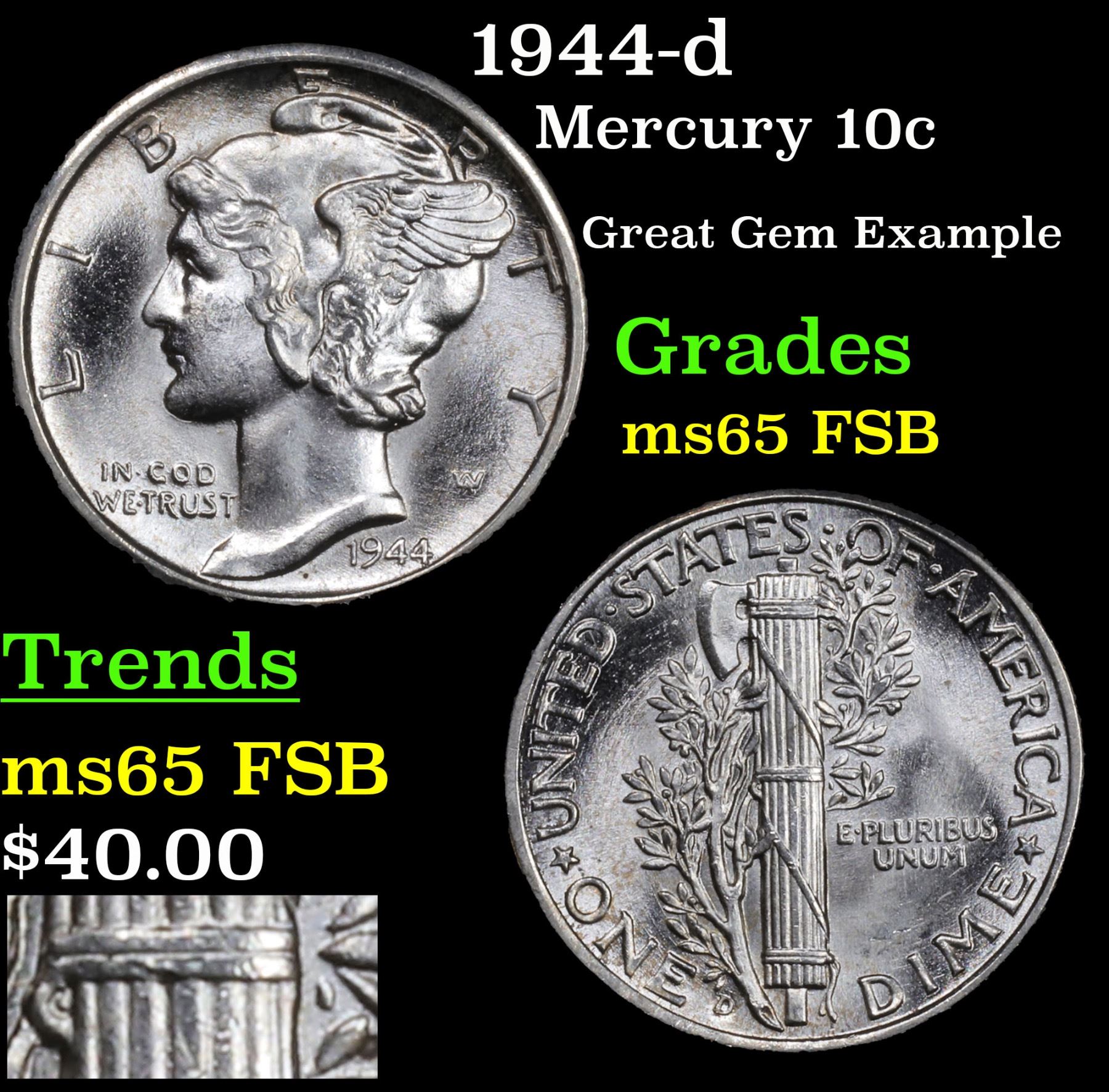 1944-d Mercury Dime 10c Grades GEM FSB.
