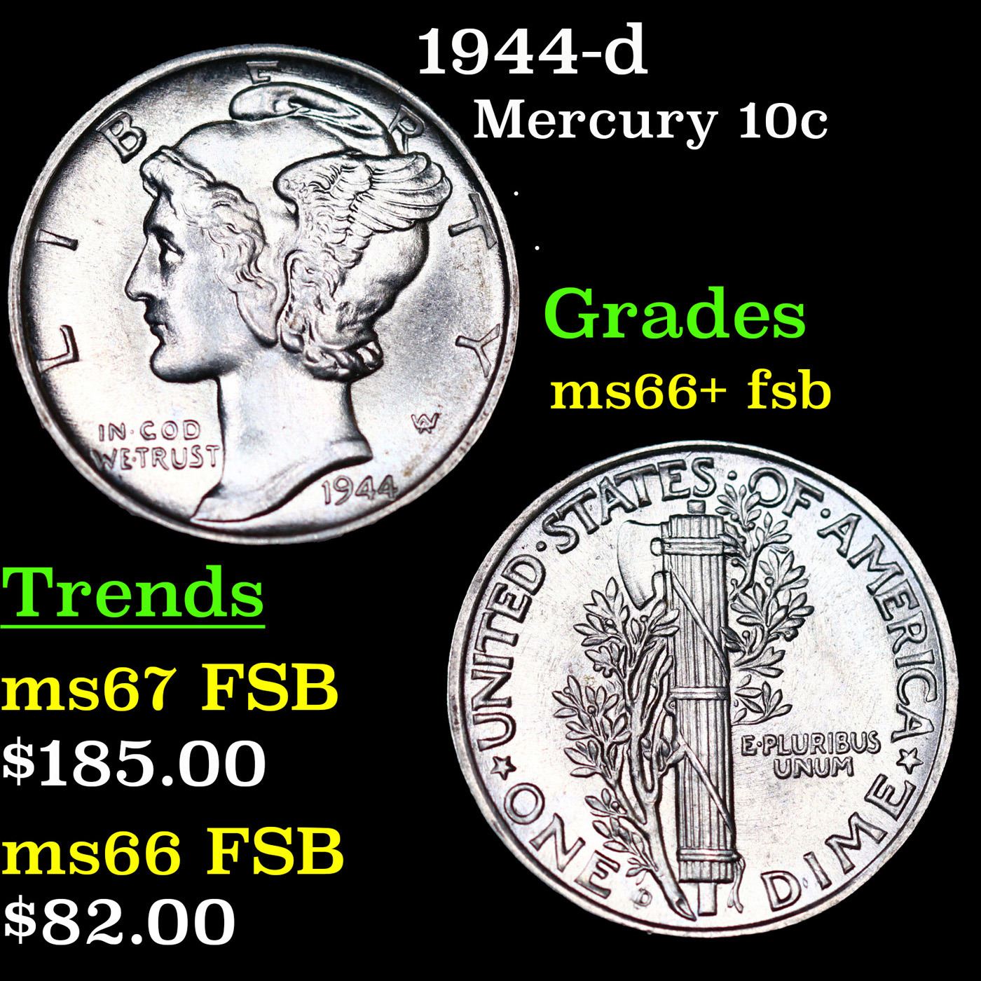 1944-d Mercury Dime 10c Grades GEM++ FSB.