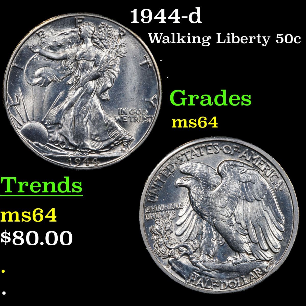 1944-d Walking Liberty Half Dollar 50c Grades Choice Unc.