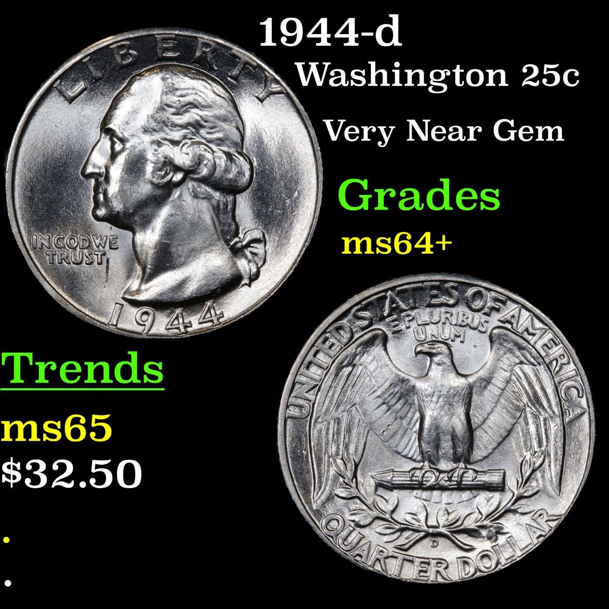 1944-d . Very Near Gem Washington Quarter 25c Grades Choice+ Unc.