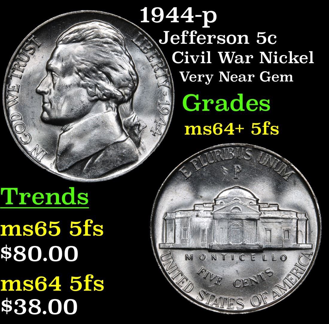 1944-p Civil War Nickel Very Near Gem Jefferson Nickel 5c Grades Choice Unc+ 5fs.