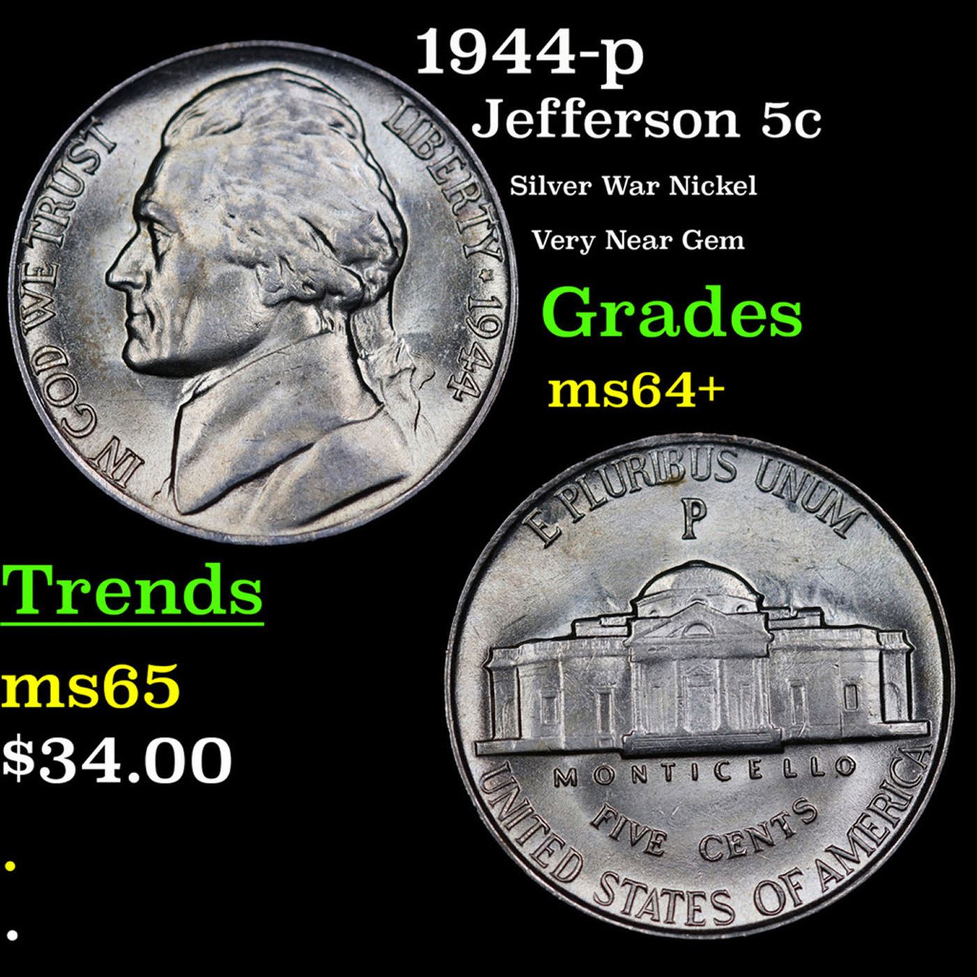 1944-p Jefferson Nickel 5c Grades Choice+ Unc.
