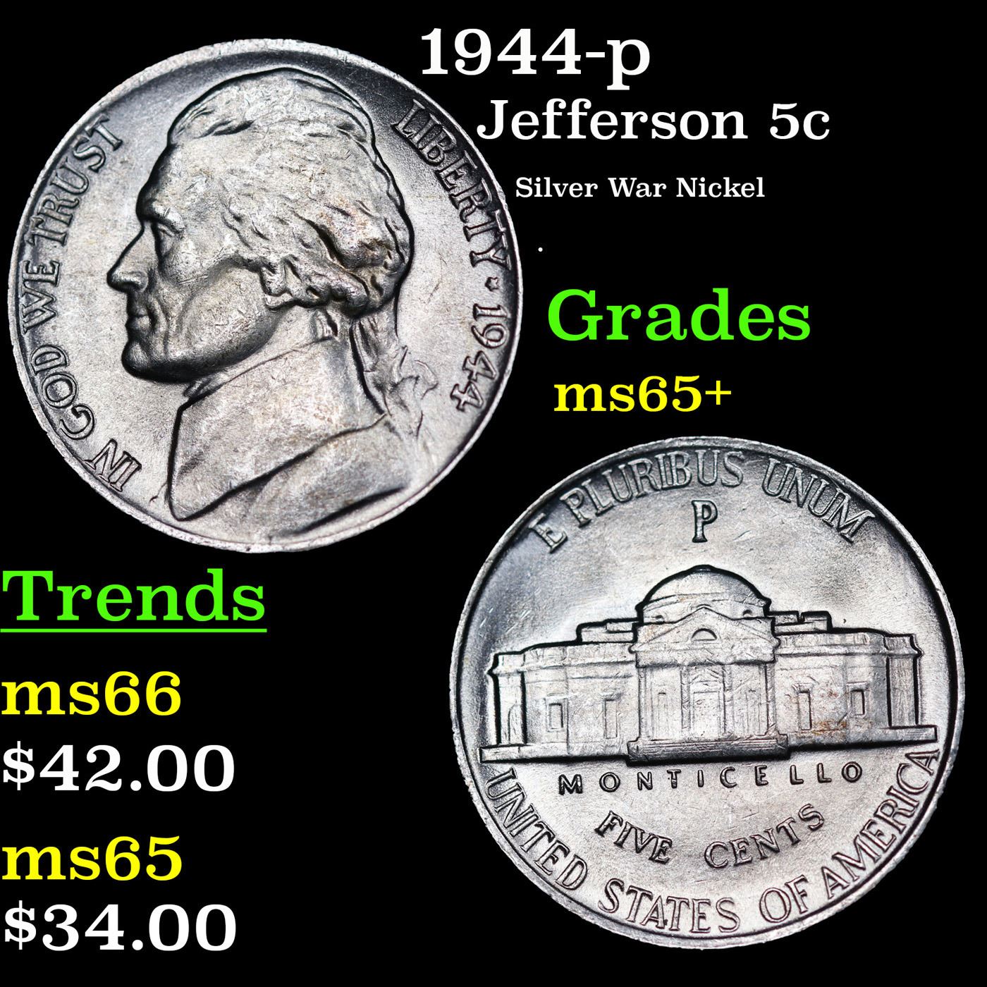 1944-p Jefferson Nickel 5c Grades GEM+ Unc.