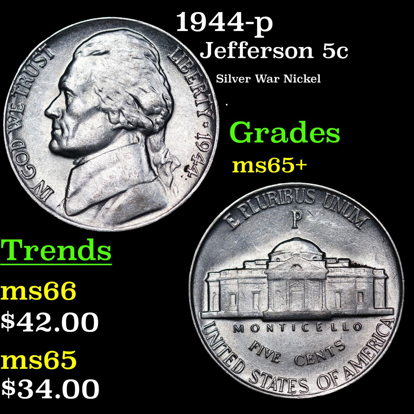 1944-p Jefferson Nickel 5c Grades GEM+ Unc.