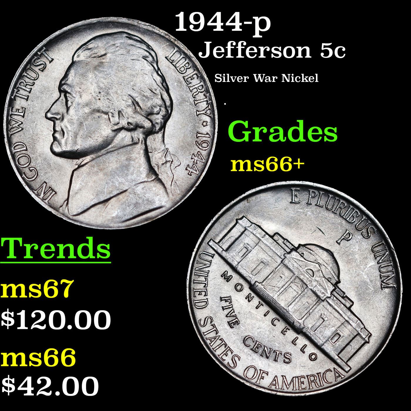 1944-p Jefferson Nickel 5c Grades GEM++ Unc.