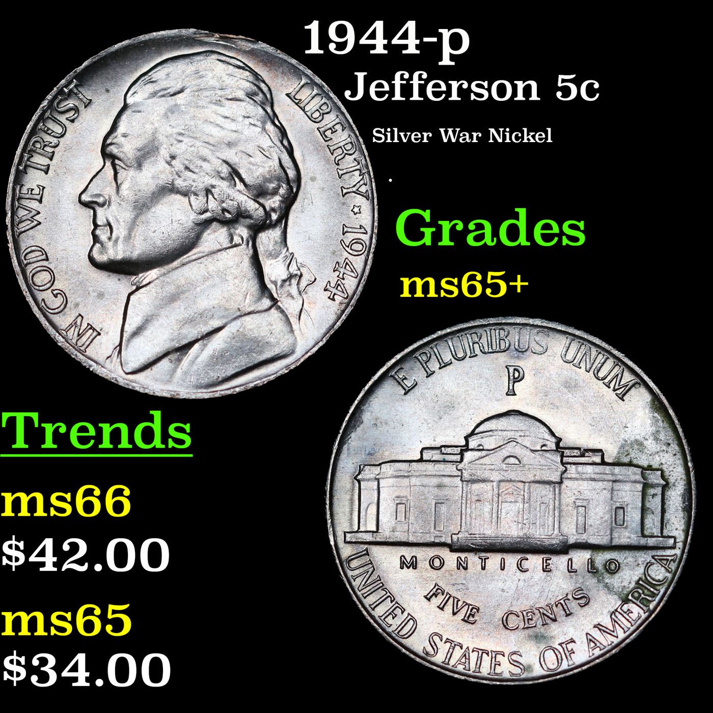 1944-p Jefferson Nickel 5c Grades GEM+ Unc.