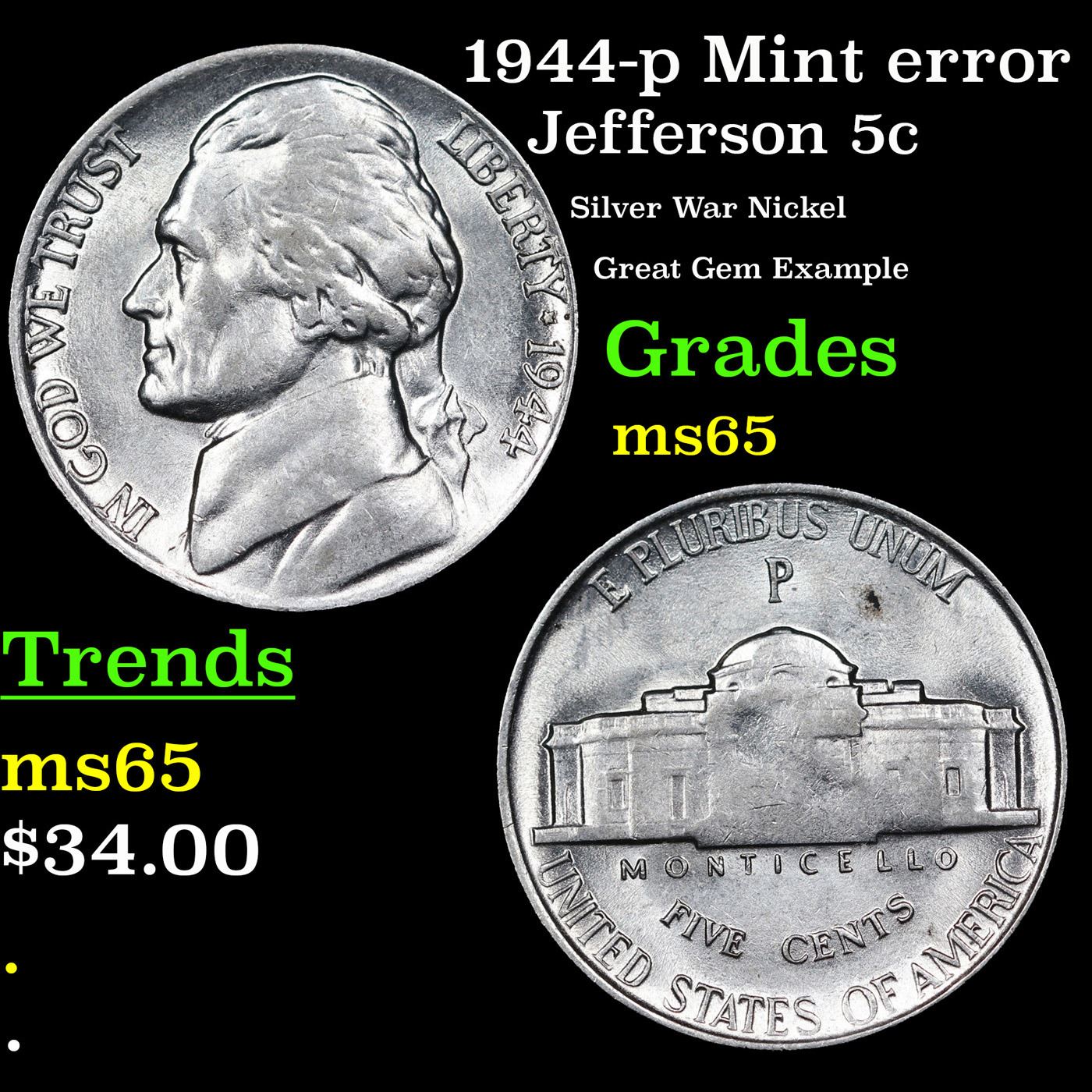 1944-p Mint error Jefferson Nickel 5c Grades GEM Unc.