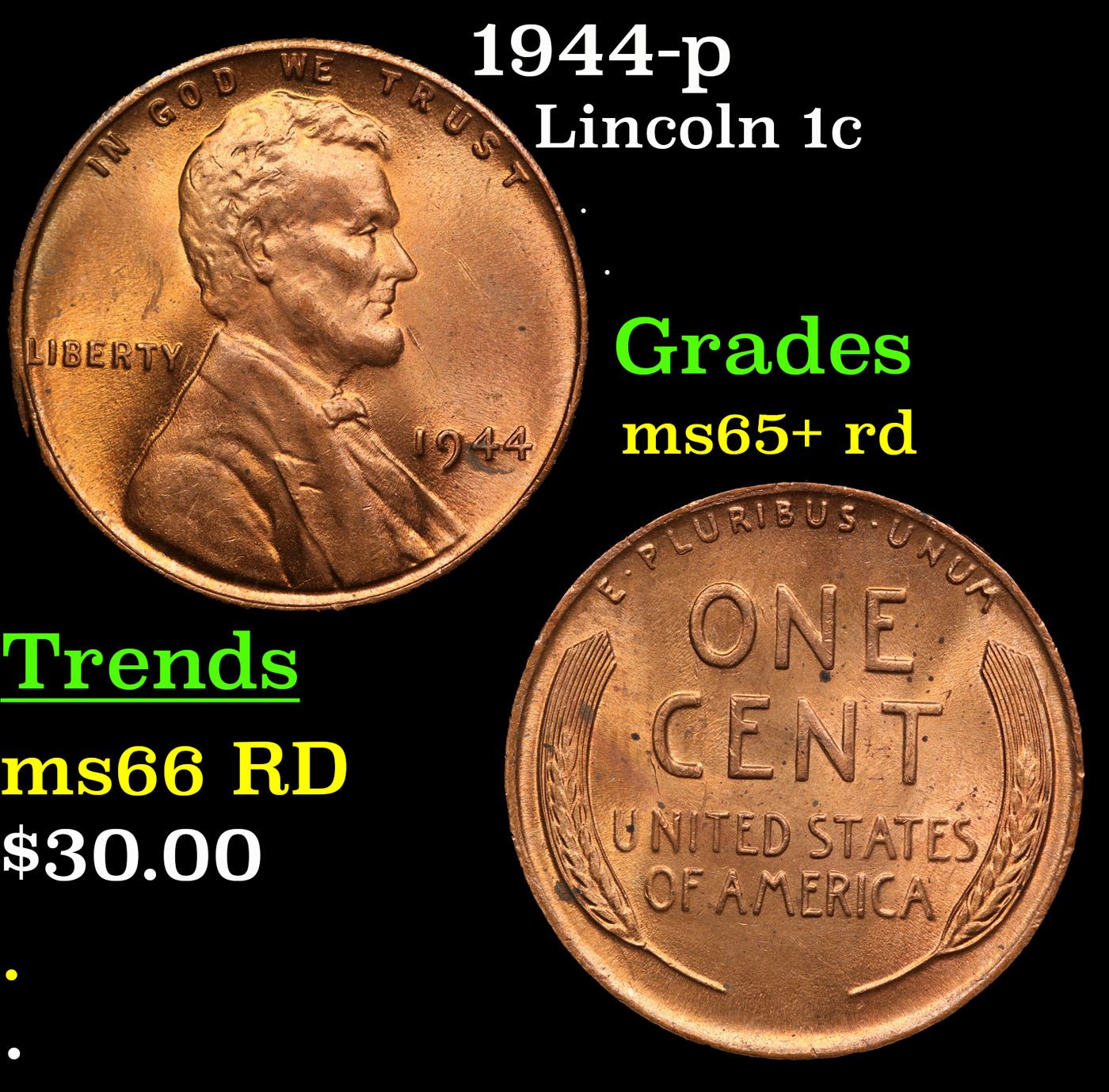 1944-p Lincoln Cent 1c Grades Gem+ Unc RD.