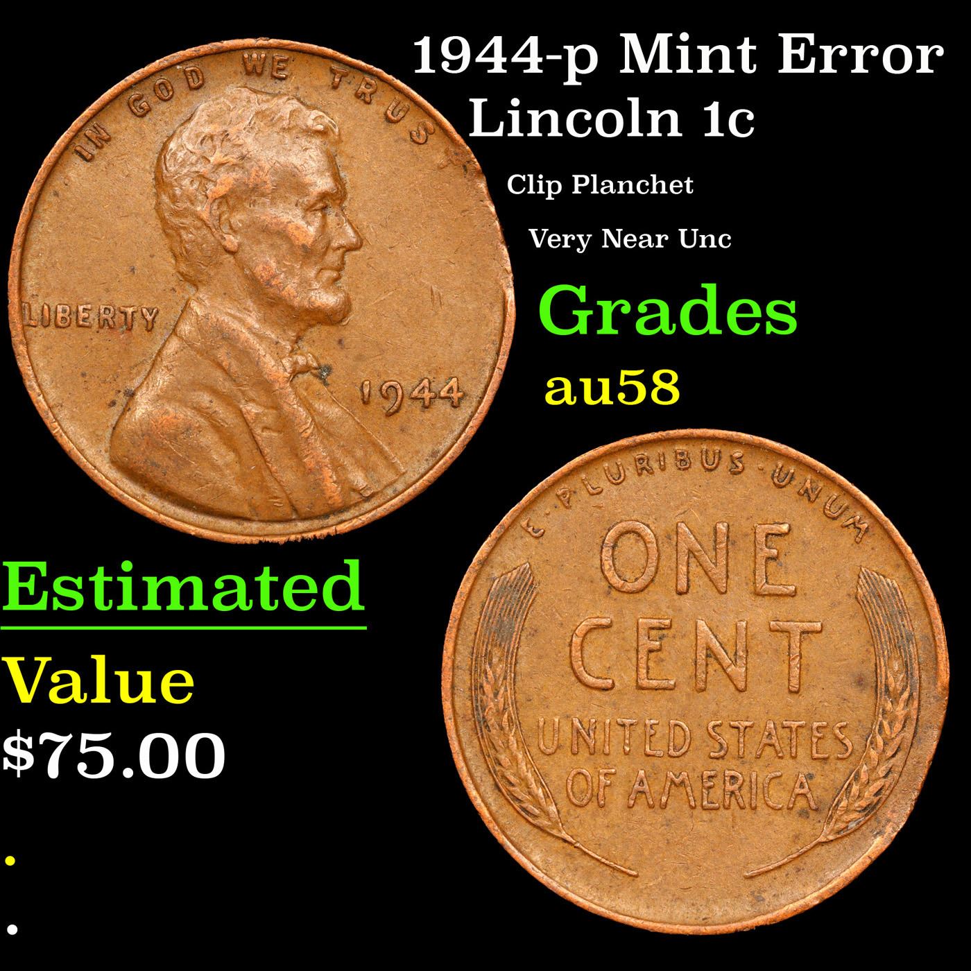 1944-p Mint Error Lincoln Cent 1c Grades Choice AU/BU Slider.