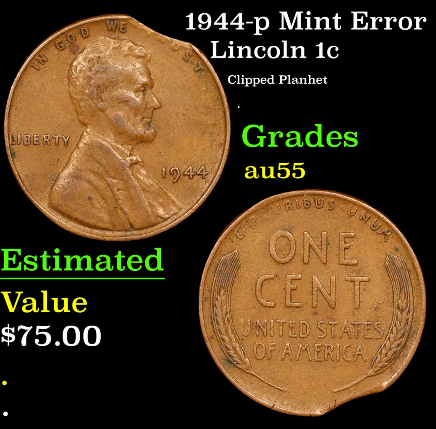 1944-p Mint Error Lincoln Cent 1c Grades Choice AU.