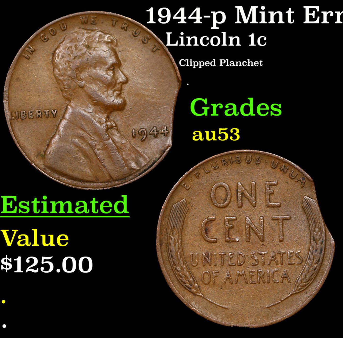 1944-p Mint Error Lincoln Cent 1c Grades Select AU.