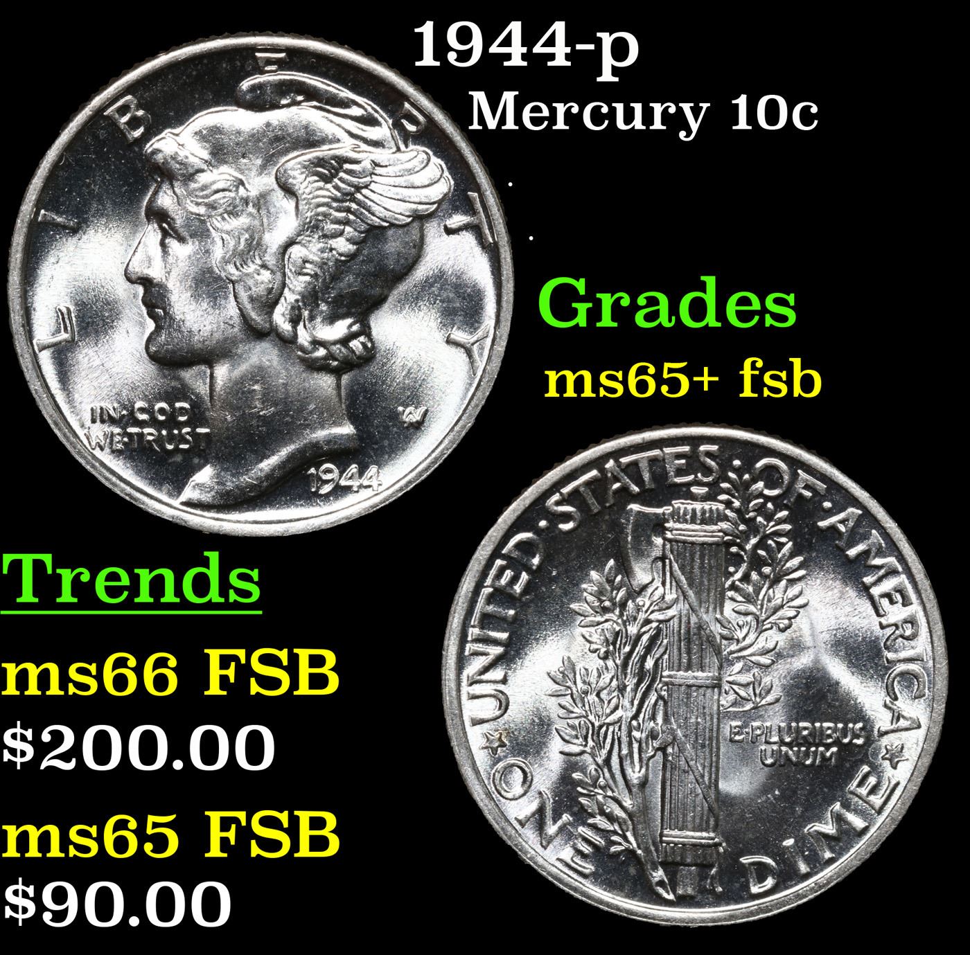 1944-p Mercury Dime 10c Grades GEM+ FSB.