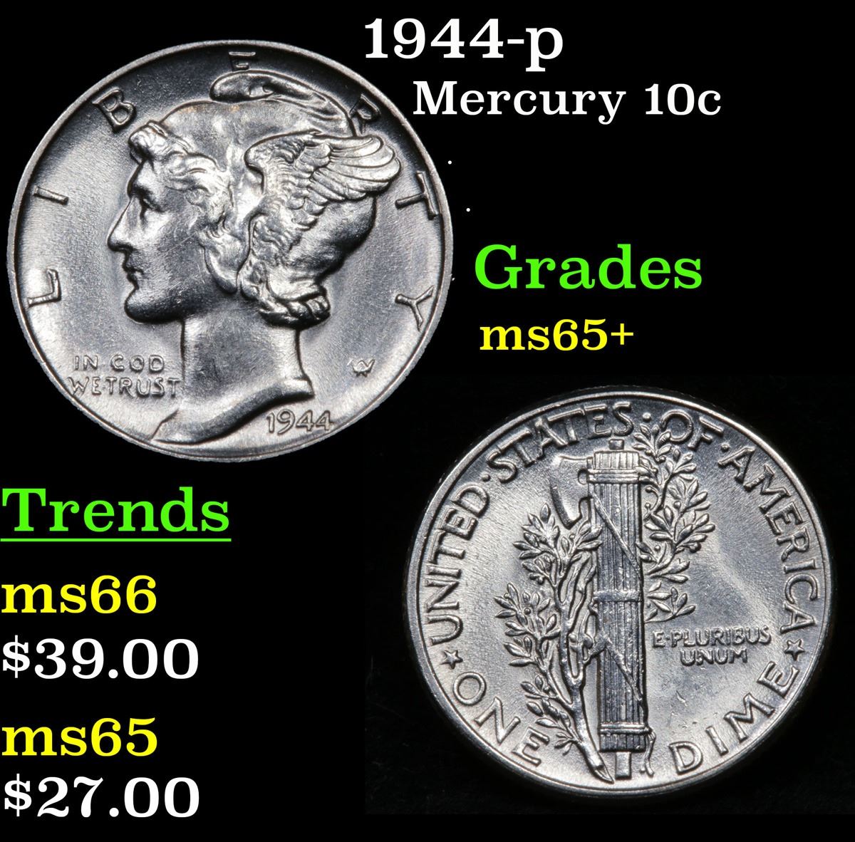 1944-p Mercury Dime 10c Grades GEM+ Unc.