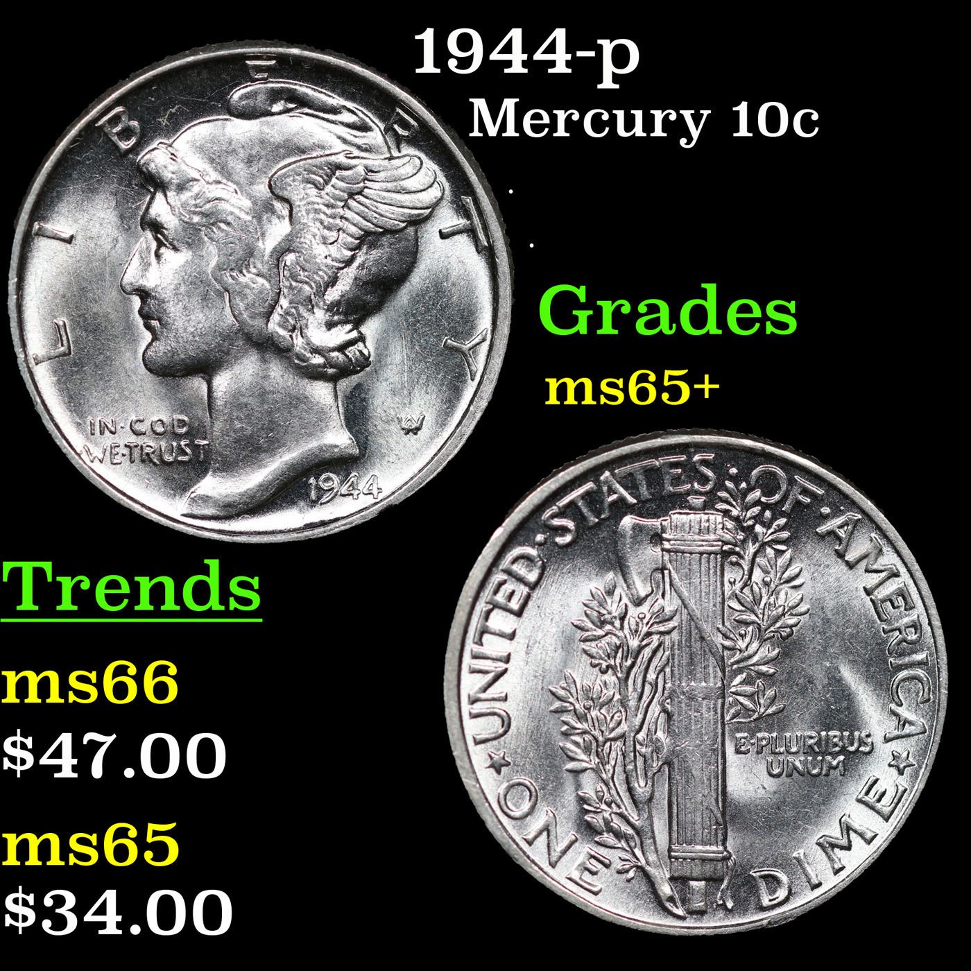 1944-p Mercury Dime 10c Grades GEM+ Unc.