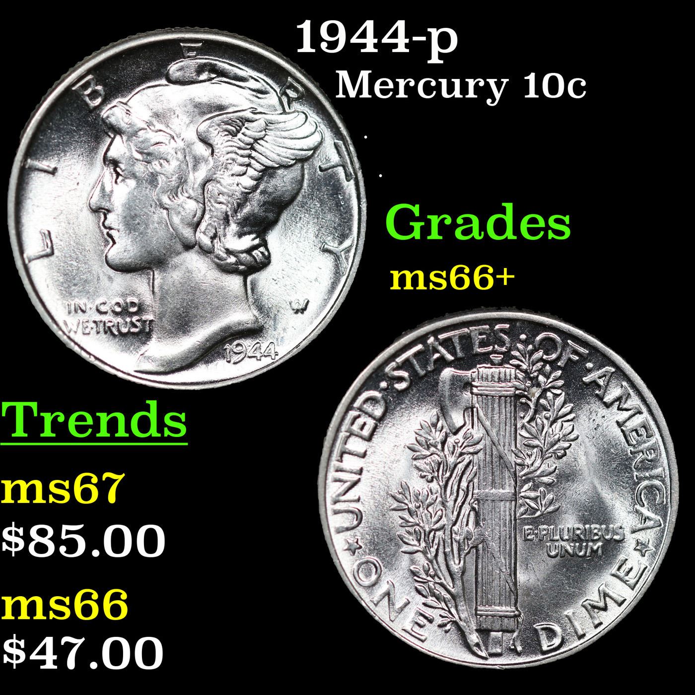 1944-p Mercury Dime 10c Grades GEM++ Unc.