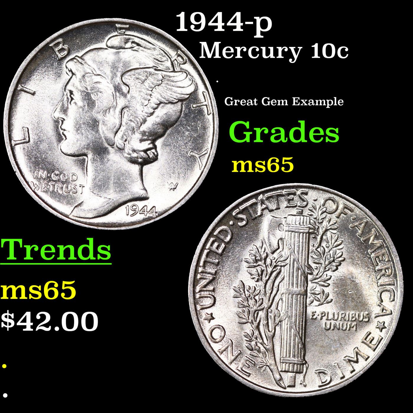1944-p Mercury Dime 10c Grades GEM Unc