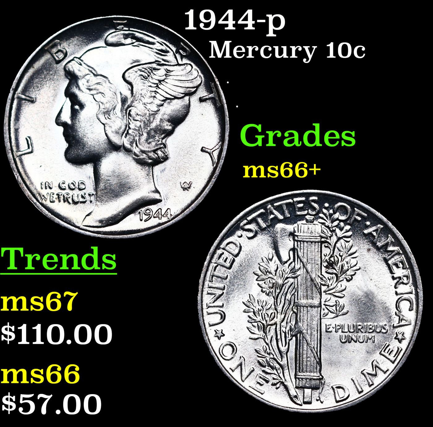 1944-p Mercury Dime 10c Grades GEM++ Unc.