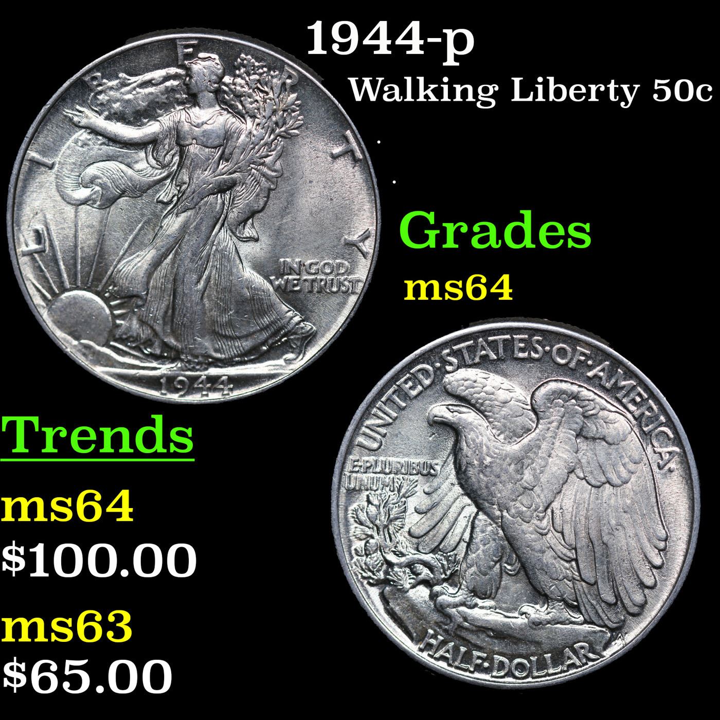 1944-p Walking Liberty Half Dollar 50c Grades Choice Unc.