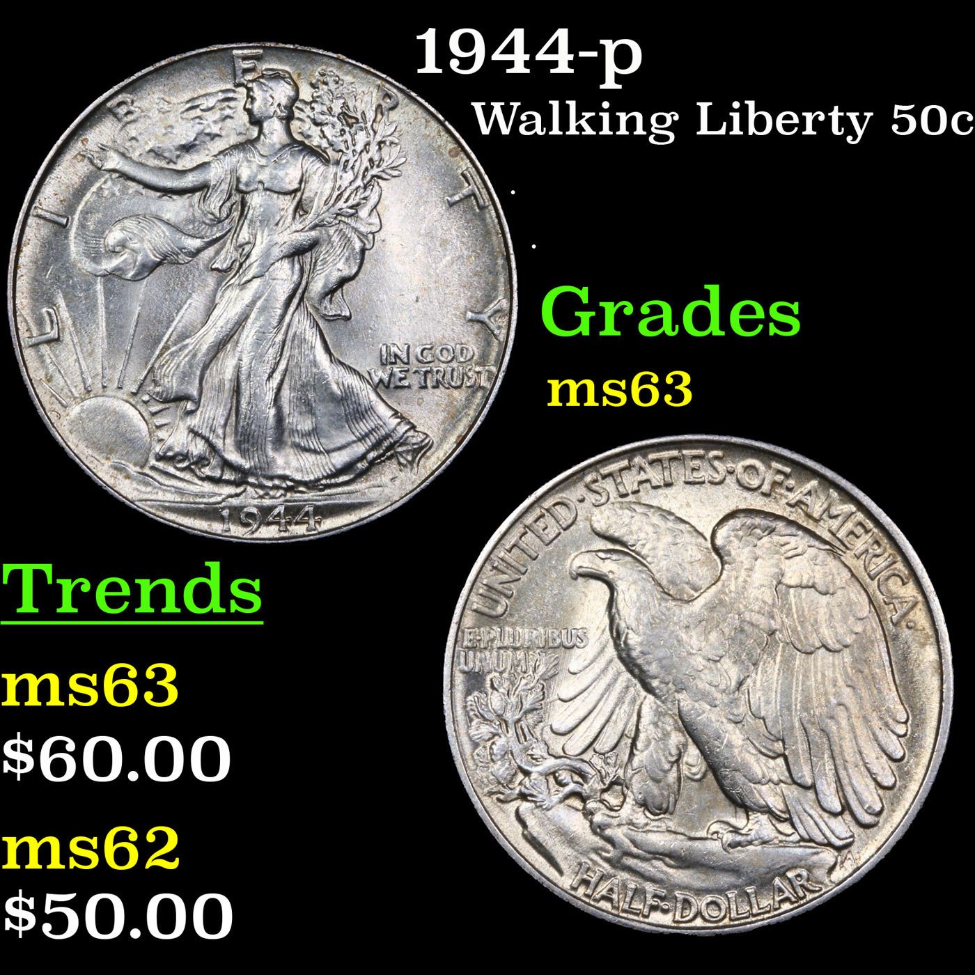 1944-p Walking Liberty Half Dollar 50c Grades Select Unc.