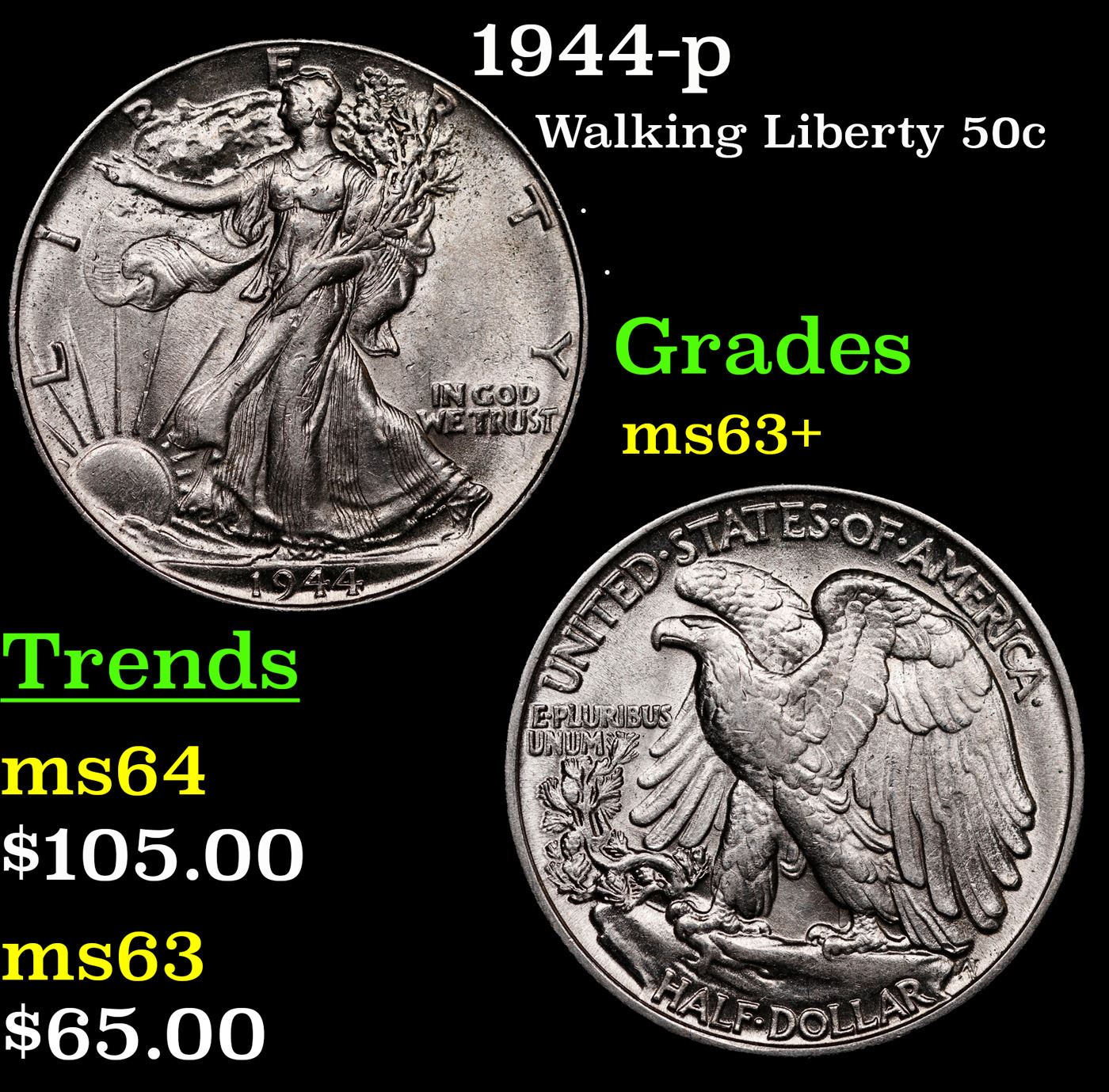 1944-p Walking Liberty Half Dollar 50c Grades Select+ Unc.