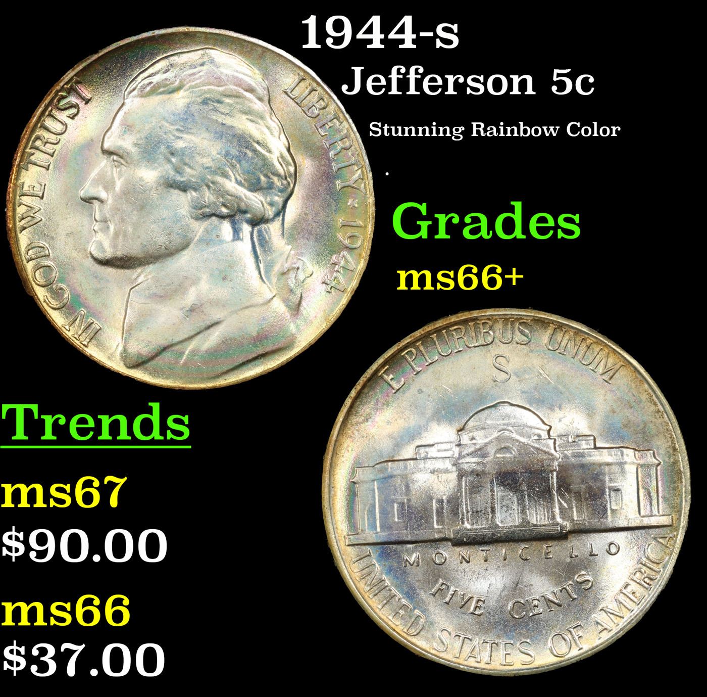 1944-s Jefferson Nickel 5c Grades GEM++ Unc.
