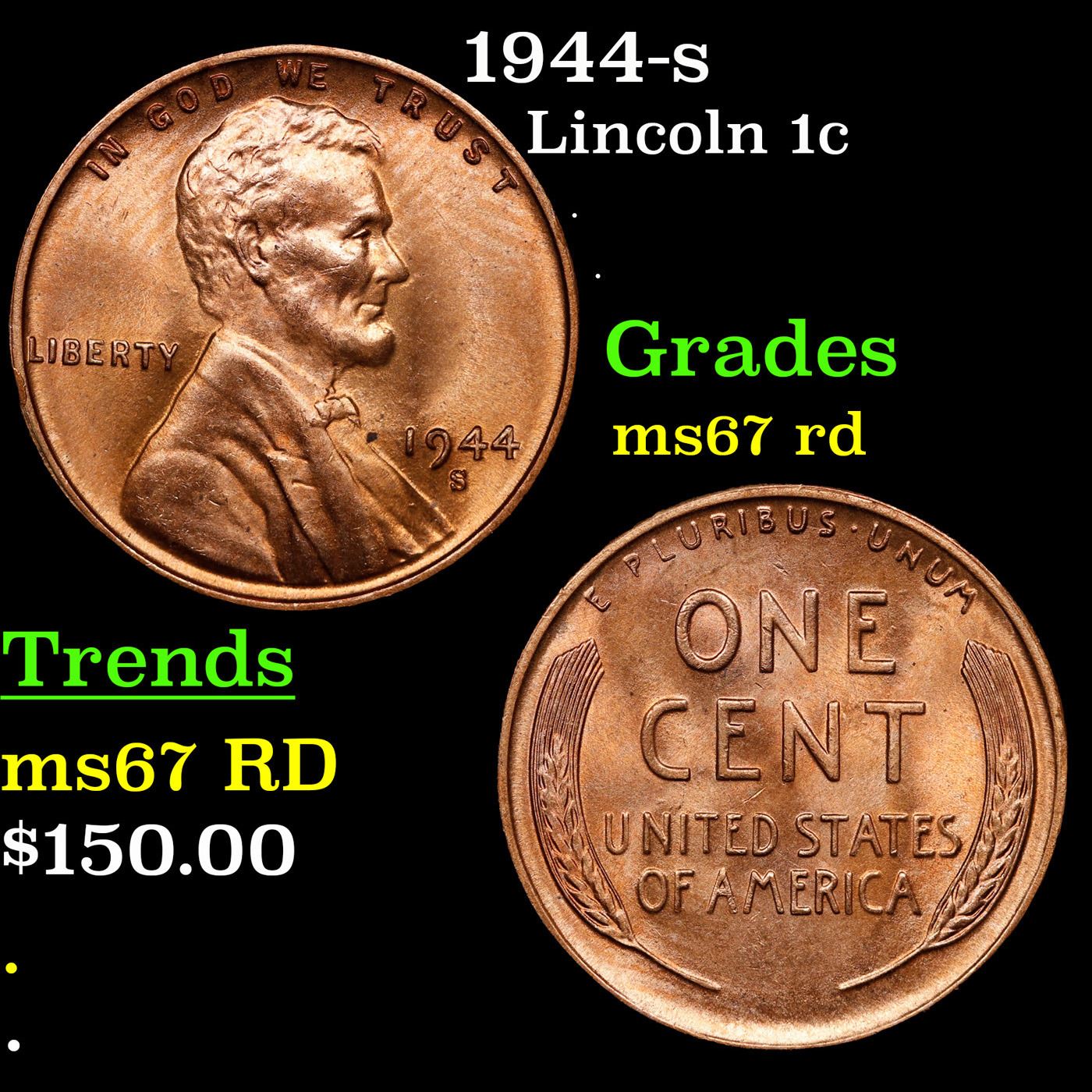 1944-s Lincoln Cent 1c Grades GEM++ Unc RD.