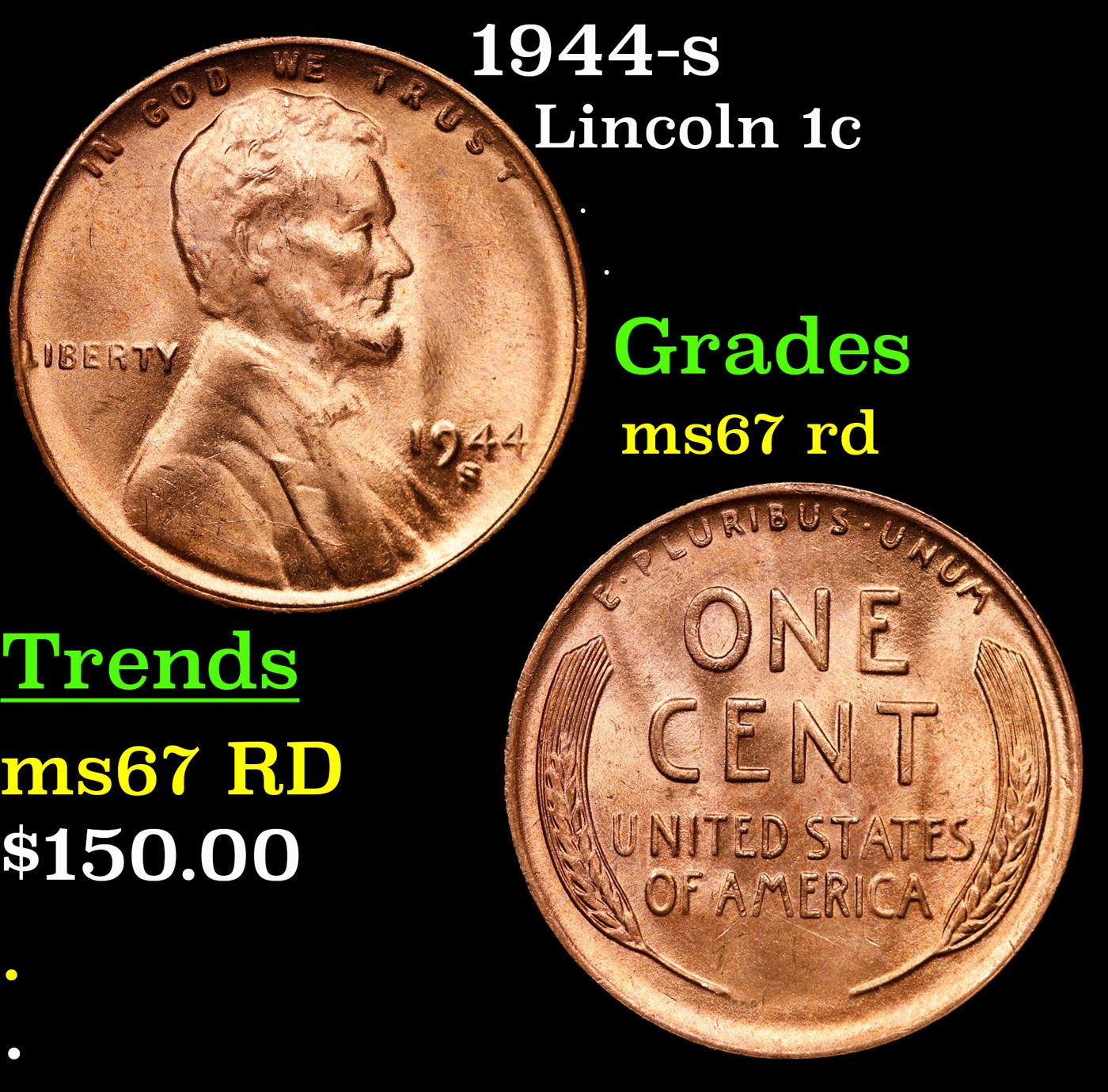 1944-s Lincoln Cent 1c Grades GEM++ Unc RD.