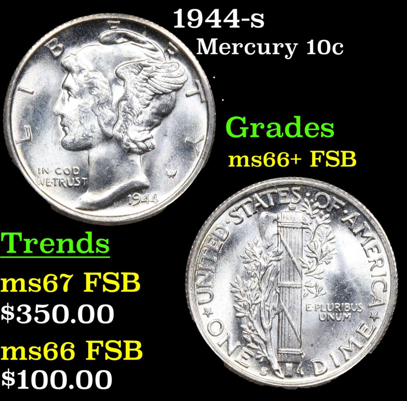 1944-s Mercury Dime 10c Grades GEM++ FSB.