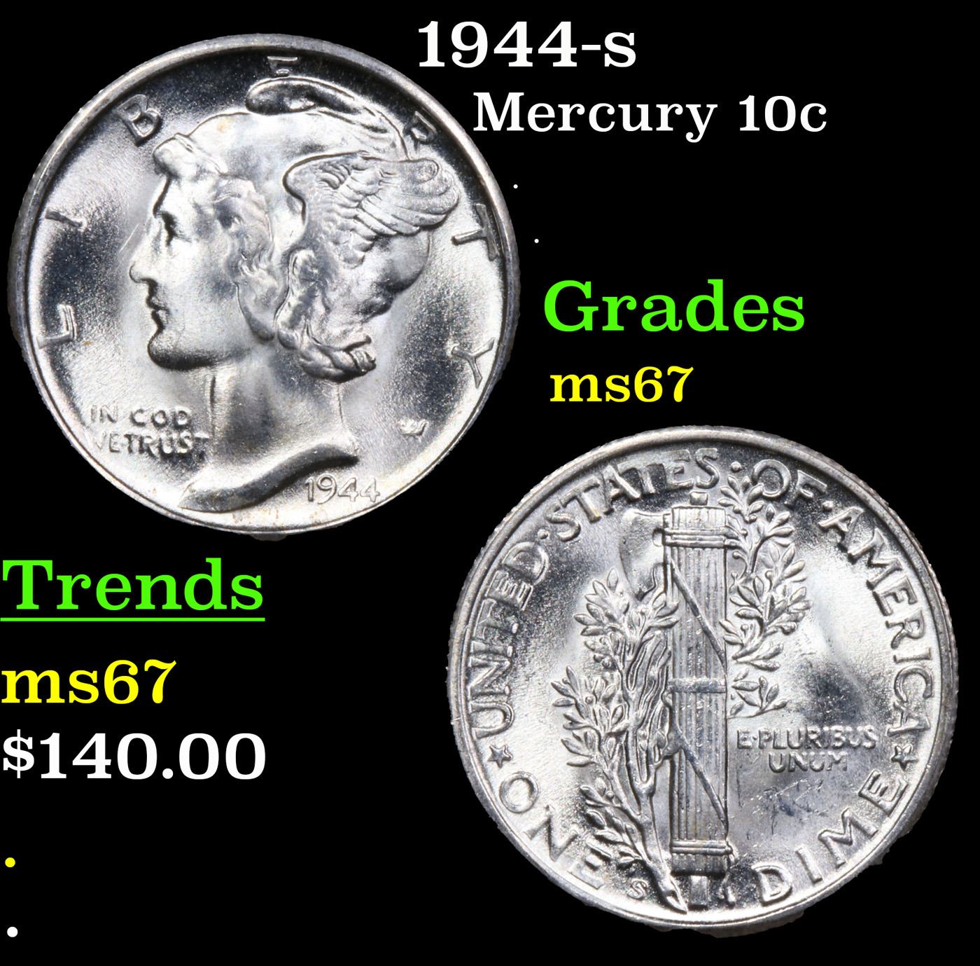 1944-s Mercury Dime 10c Grades GEM++ Unc.
