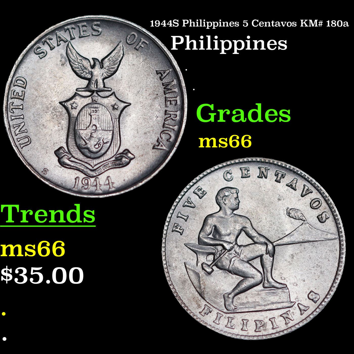 1944S Philippines 5 Centavos KM# 180a Grades GEM+ Unc.