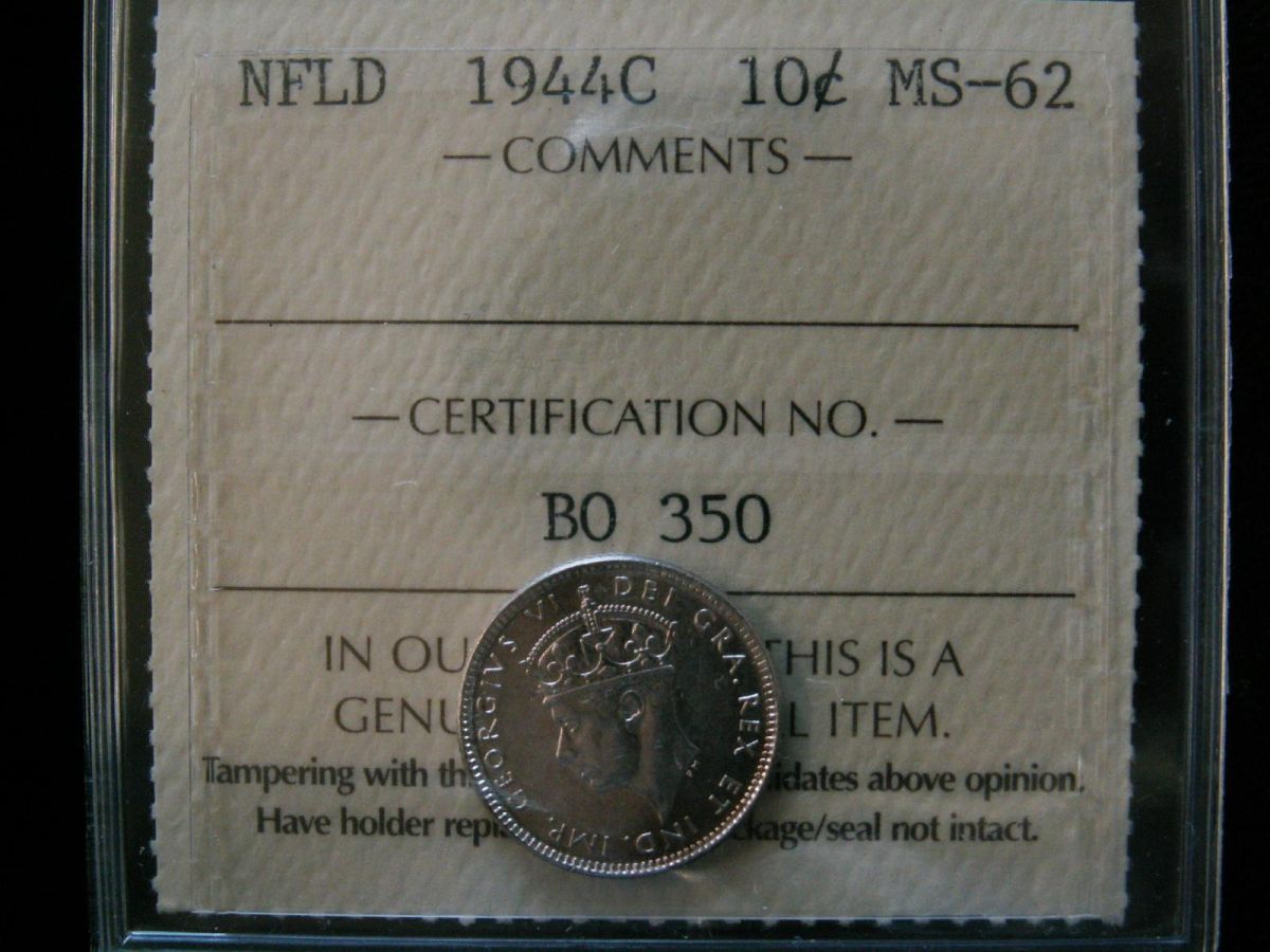 1944c Nfld 10¢ ICCS MS62. Full white coin.