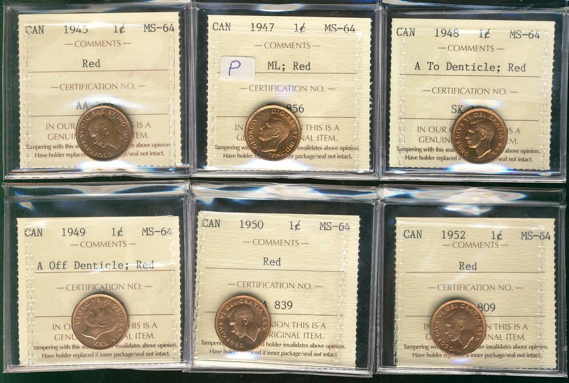 1945 1, 1947ML, 1948 A To, 1949 A Off, 1950 & 1952 ICCS MS64RD. Lot of 6 coins.