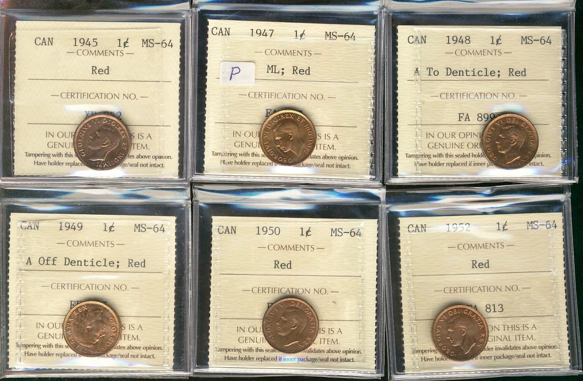 1945 1, 1947ML, 1948 A To, 1949 A Off, 1950 & 1952 ICCS MS64RD. Lot of 6 coins.