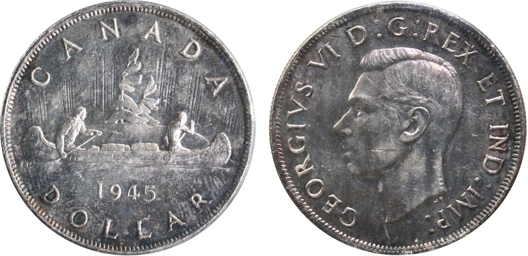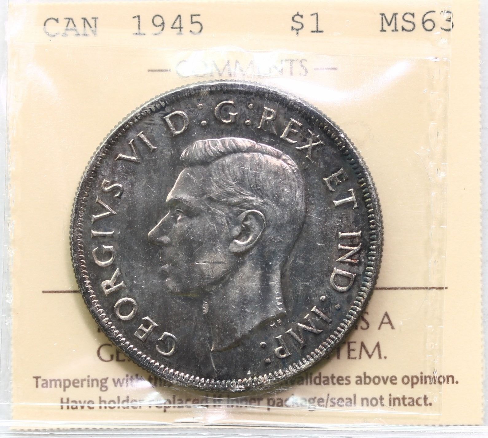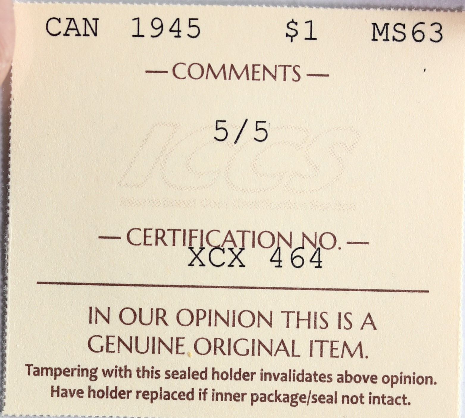 1945 $1 "5/5" ICCS Choice Mint State-63 Light silver grey and russet tones over full underlying lustre.