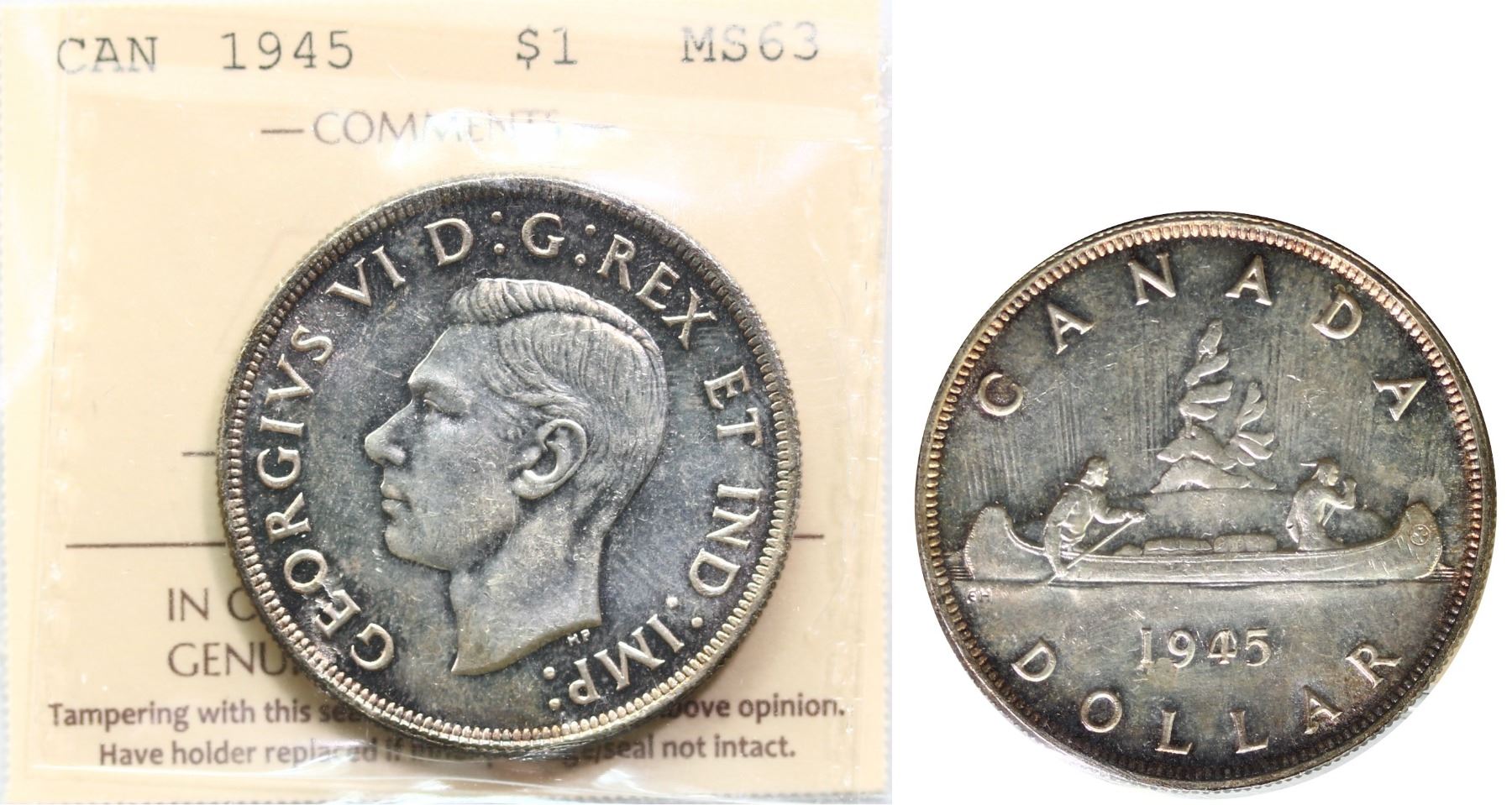 1945 $1 ICCS Choice Mint State-63 Attractive gold and light russet tones over full underlying lustre. A nice appealing example.