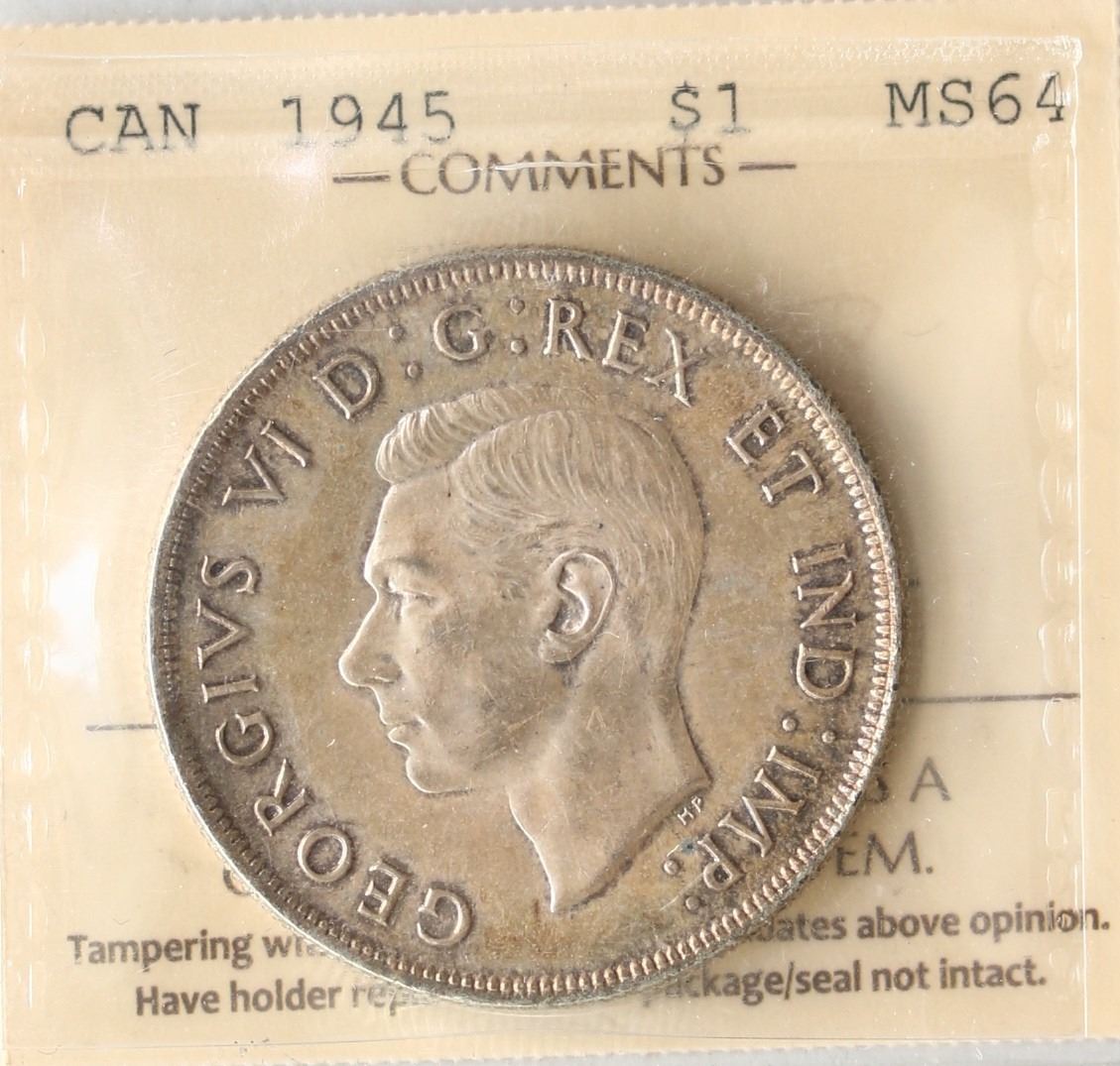1945 $1 ICCS Choice Mint State-64 Lightly toned. Scarce in this condition