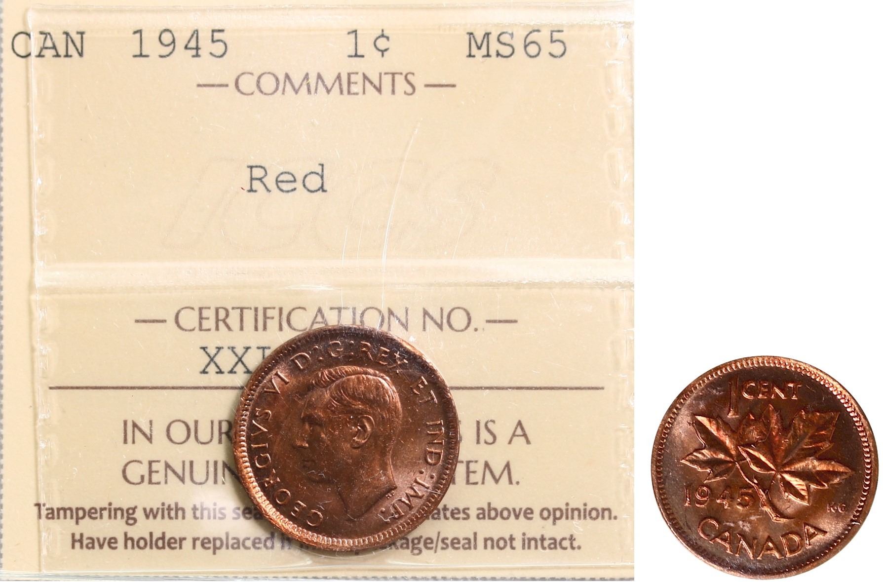 1945 1¢ ICCS Gem Mint State-65 Red 95% Red Lustre.