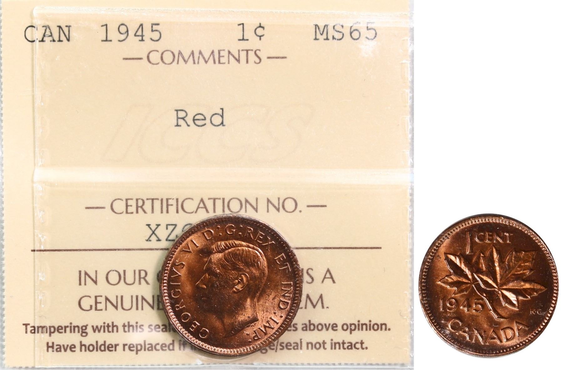 1945 1¢ ICCS Gem Mint State-65 red. Nice wine red example.