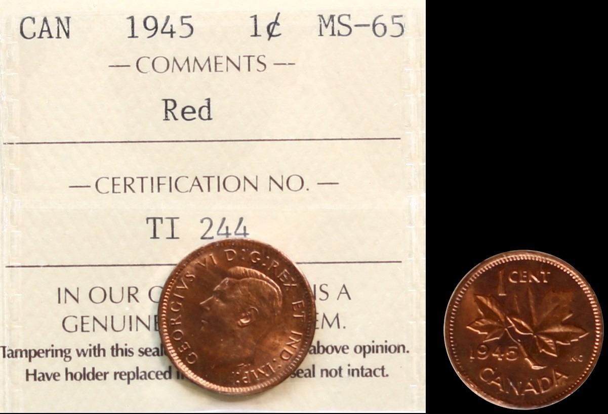 1945 1¢ ICCS Gem Mint State-65RED. Full red.